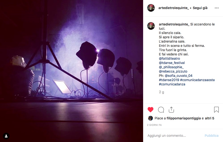Ad Aosta si mirano sostanzialmente a due categorie di spettatori: una è il “club degli host”, ogni anno in espansione, ovvero un gruppo di aostani che in questa edizione o nelle precedenti hanno ospitato un’artista a casa loro. Gli host godono di sconti e convenzioni e hanno anche eventi speciali dedicati a loro (ad esempio uno spettacolo in esclusiva). La seconda sono gli studenti del Liceo Artistico, in campo grazie al progetto di alternanza scuola/lavoro. In totale grazie a queste due attività si sono contate quest’anno quasi 200 persone coinvolte. Il percorso con gli studenti è nato nel 2017 con la prima edizione di #ComunicadanzaAOSTA e si è consolidato in questi primi tre anni. L’uso di Instagram, degli smartphone e la creazione di un vero contest con premiazione finale serve da dispositivo per mettersi in ascolto degli adolescenti, far conoscere loro un mondo (quello della danza e del teatro) che amano senza saperlo e far capire che ci interessa anche il loro punto di vista.